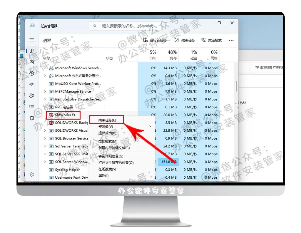 28.在键盘上同时按住【Ctrl+Shift+ESC】键打开任务管理器,,鼠标右击【sldworks_fs】选择【结束进程】。