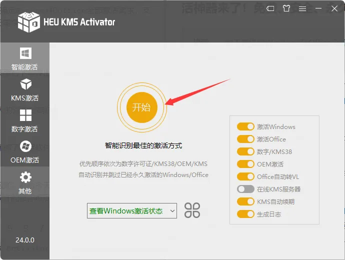 打开程序后,点击 【智能激活】-【开始】 按钮,工具会自动检测并选择最佳激活方式。