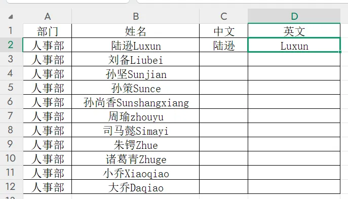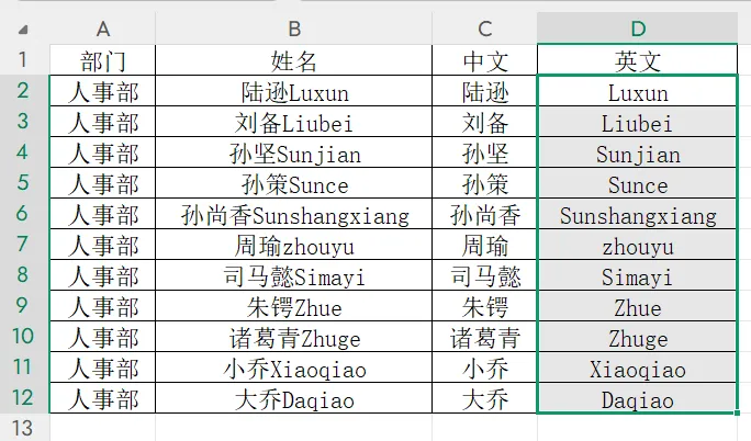 选中D2:D12列,按Ctrl+ E,即可只能提取所有英文