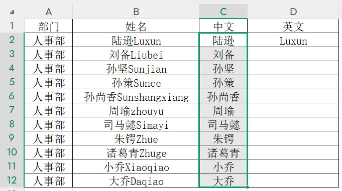 选中C2:C12列,按Ctrl+ E,即可只能提取所有中文