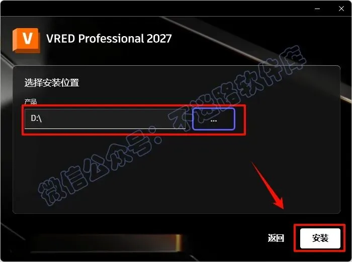 4.选择软件安装路径,建议和教程中的保持一致,本例安装在D盘(如:将C改为D表示安装到D盘或,安装路径不要出现中文),点击“安装”