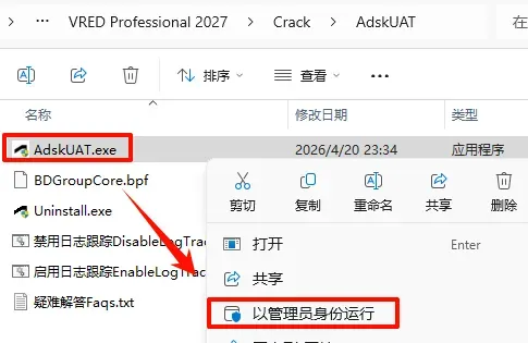 7.返回之前解压的“VRED Professional 2027”文件夹,依次打开“Crack——AdskUAT”文件夹,选中“AdskUAT.exe”文件,鼠标右键选择“以管理员身份运行”