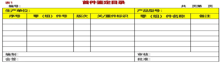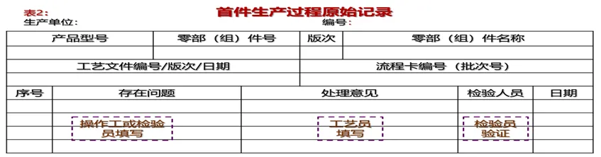 提示:该表是首件鉴定的策划文件,所列入的信息来自于参与首件鉴定的所有零部(组)件的工艺规程。(二)在图1的自然流程“按工艺加工零件”和“5.3.3生产过程检验”中应输出的记录,见表2所示