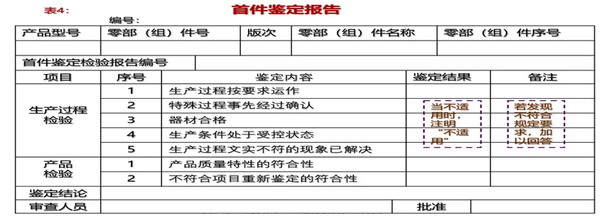 提示:表4的主要内容对图1“5.3.3生产过程检验”和“5.3.4 产品检验”的审查结果,在首件鉴定会议上进行讨论后形成。紫色虚线方框中的文字是我给出的填写该表格相关栏目的提示。好了,今天就侃到这里。码字不易,期望关注、点赞和转发。您若需要更多的知识点,可加我的微信xp510168950,联系我的《首件鉴定与关重特性和关键过程控制等新版国军标宣贯》课程。