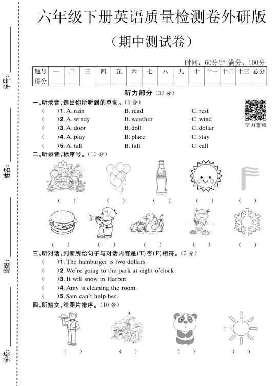 大家好,今天欣妈给大家分享的是:快要期中考试了,2026春六年级外研版英语期中模拟检测卷已发布,电子版可下载打印。通过这次测试能够查漏补缺,梳理知识点,总结做题方法,提升答题准确率,家长们给孩子打印出来,测试完成后对照答案,及时订正!