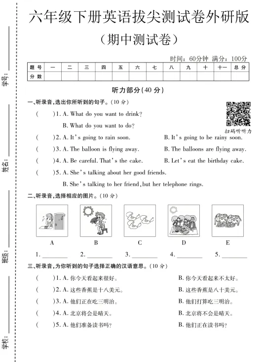 「六年级(下)英语 期中真题测试卷《外研版》