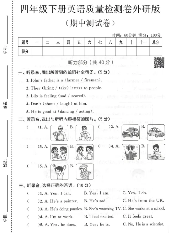 大家好,今天欣妈给大家分享的是:快要期中考试了,2026春四年级外研版英语期中模拟检测卷已发布,电子版可下载打印。通过这次测试能够查漏补缺,梳理知识点,总结做题方法,提升答题准确率,家长们给孩子打印出来,测试完成后对照答案,及时订正!