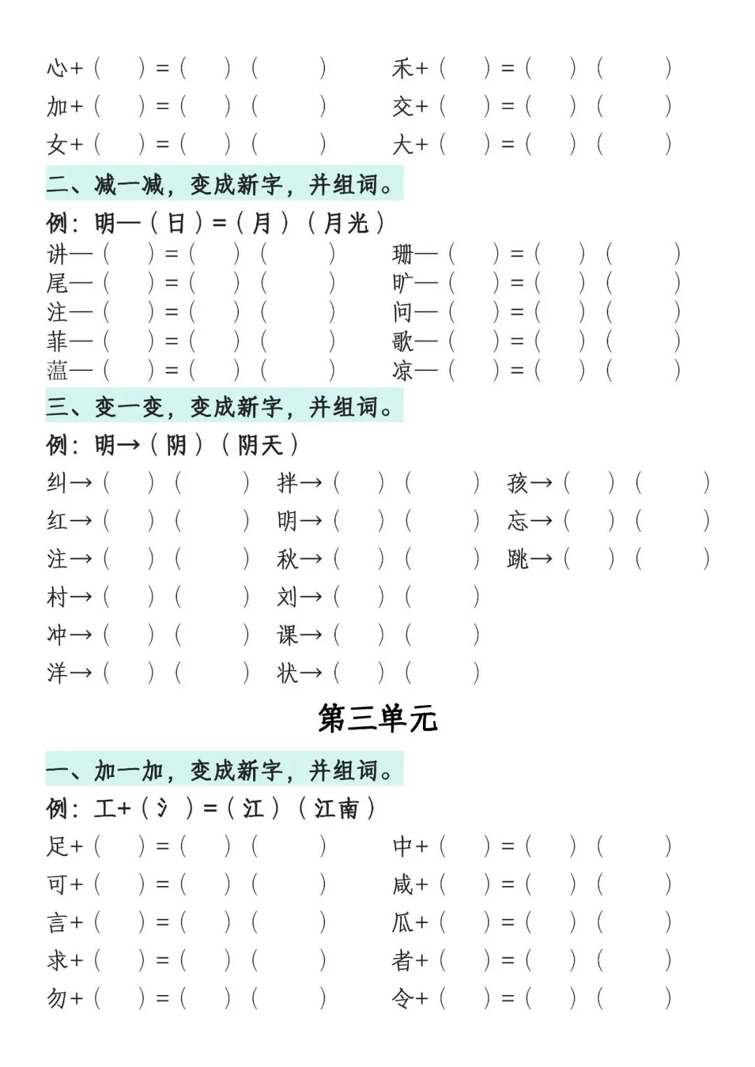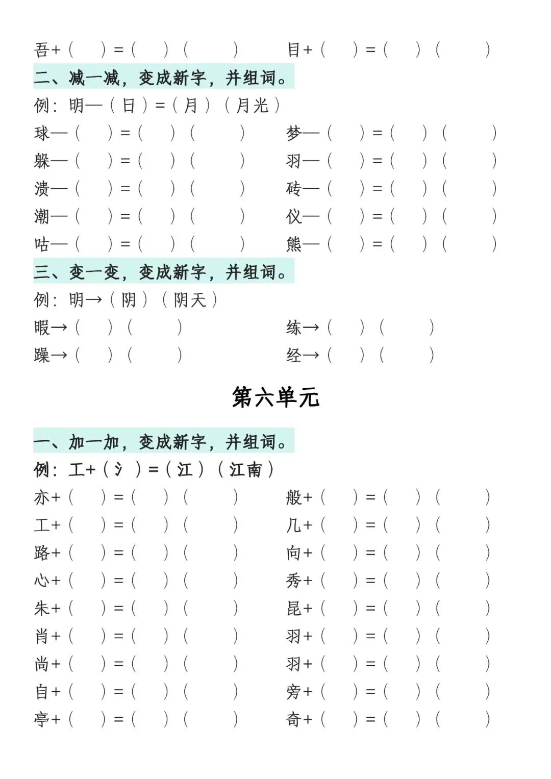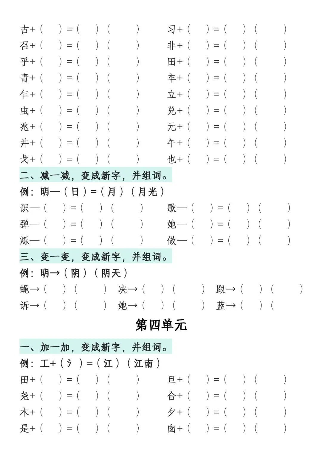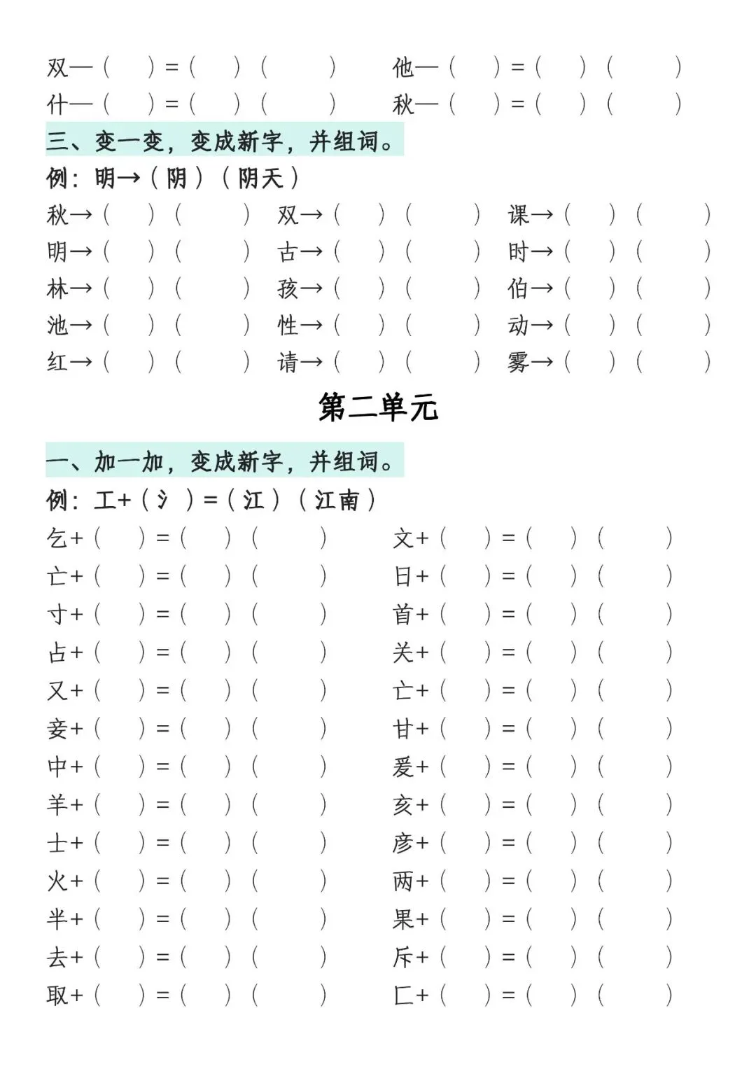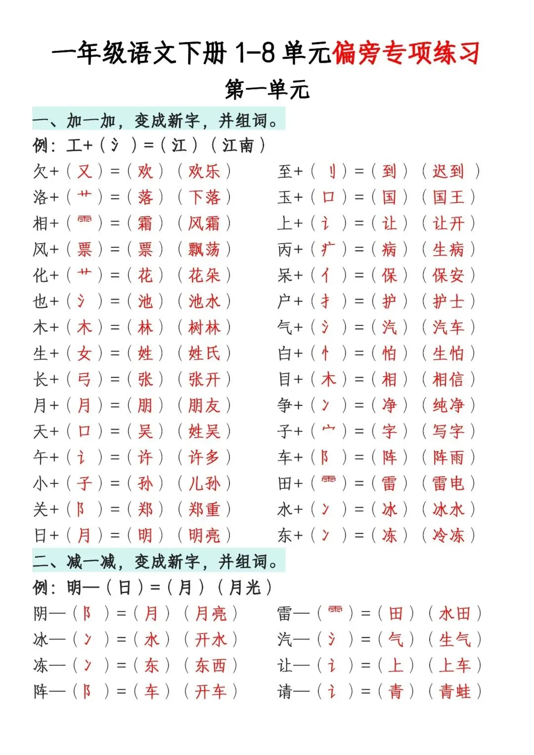 一年级语文下册1-8单元偏旁部首专项训练可打印份大家好,这里是淘学学资料库,这份《一年级语文下册 1-8 单元偏旁专项练习》,完整 pdf 电子档共22页。这份资料按 1-8 单元编排,包含加一加、减一减、变一变三种偏旁造字题型,通过偏旁组新字、组词练习,帮助孩子掌握汉字构造规律,牢固识记生字,提升识字效率。这份专项练习紧扣课本偏旁知识点,题型经典、针对性强,每道题都能强化孩子对偏旁部首的理解与运用,系统夯实汉字基础,有效提升认字、写字、组词能力,适合日常巩固、单元复习和考前查漏补缺,是一年级下册识字认字的必备练习资料。(公众号底部菜单查看完整pdf获取方式)01截图预览(因篇幅有限,仅展示部分内容)02文件目录一年级语文下册1-8单元偏旁专项练习.PDF (22页)03获取方式公众号底部菜单查看完整pdf获取方式END