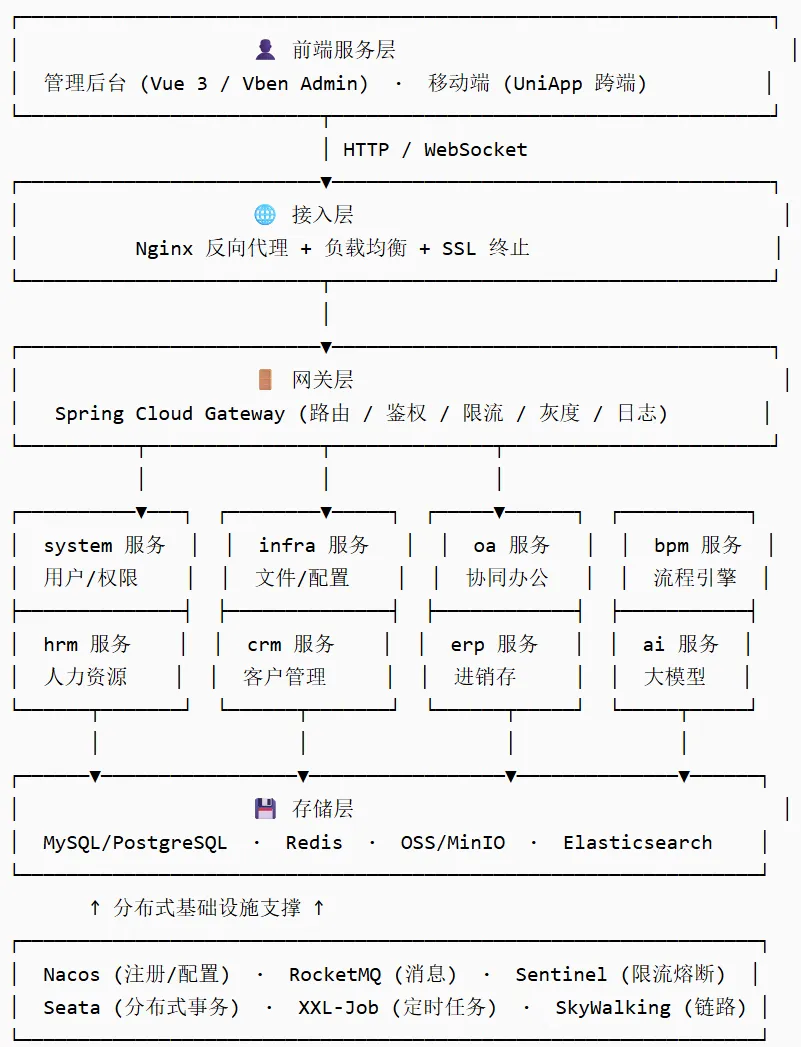 ▲ RuoYi Office 微服务技术架构:从前端 Vue/UniApp → Nginx 接入 → Spring Cloud Gateway 网关 → 微服务集群 → MySQL/Redis/OSS/ES 存储,配合 Nacos、RocketMQ、Sentinel、Seata、SkyWalking 等分布式基础设施