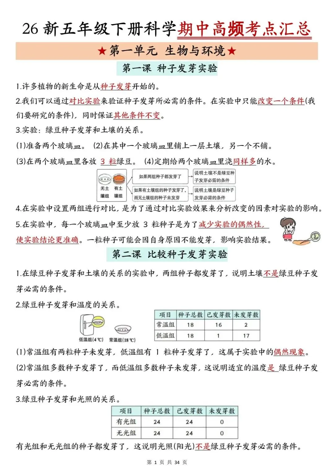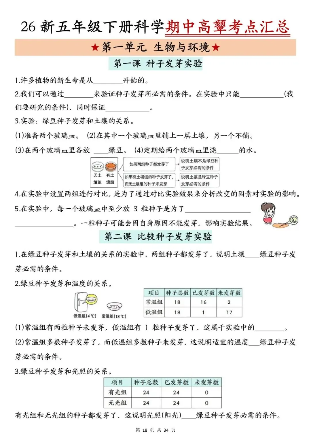 教科版26年新五年级下册科学《1-4单元期中高频考点汇总》有空白版,电子版可打印。介绍了种子发芽实验、植物生长需求、动物环境适应性、食物链和生态瓶制作等核心考点内容;期中考试临近了,需要的老师和家长及时领取打印出来,让孩子读一读背一背吧。