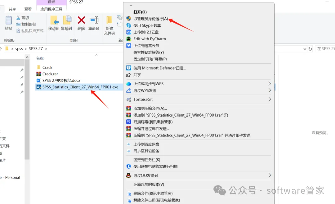 3. 鼠标选中“SPSS_Statistics_Client_27_Win64_FP001.exe”右击选择“以管理员身份运行”