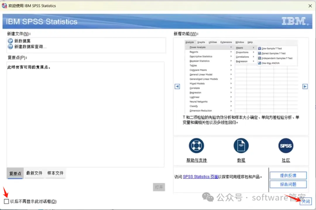 16. 回到桌面,找到“IBM SPSS Statistics 27”,双击运行,勾选“以后不再显示此对话框”,点击“关闭”