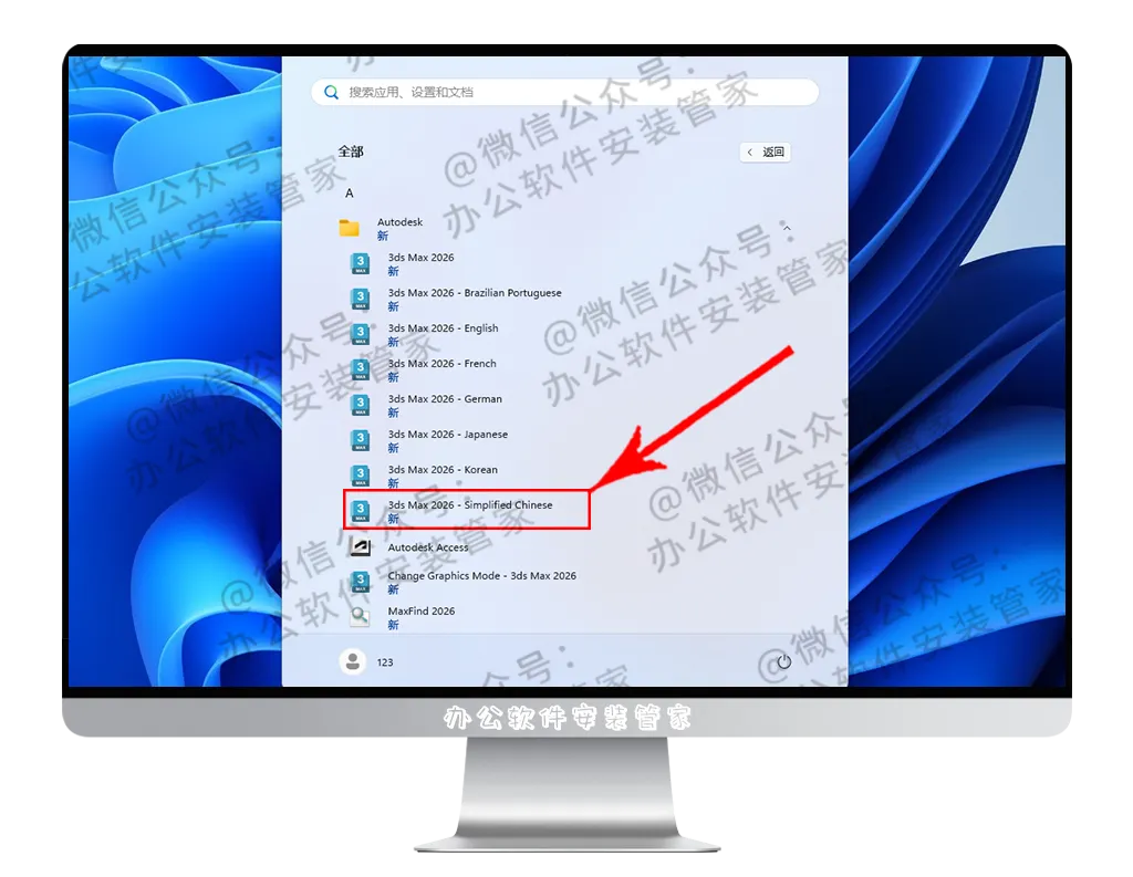 在里面找到并打开:3ds Max 2026 - Simplified Chinese