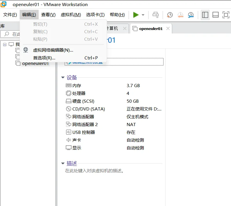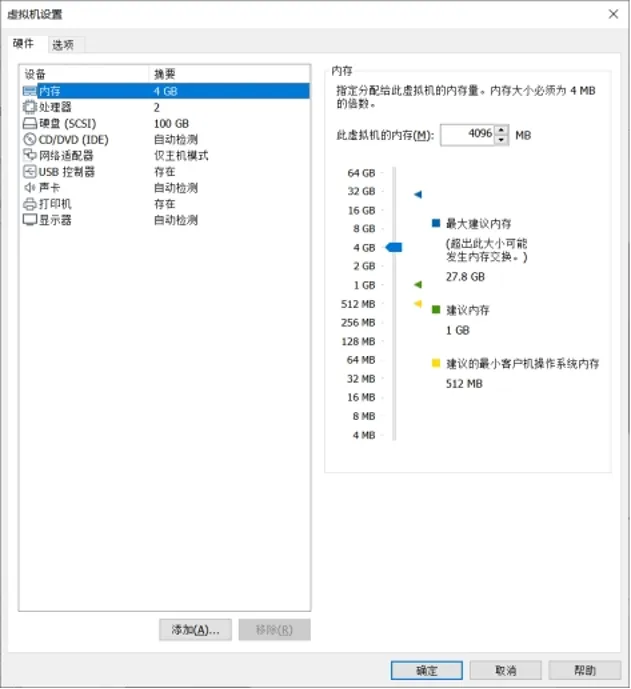 虚拟机安装向导完成后,还需要配置一下网卡。我们云计算的玩法是分布式,所有主机要在一个网段,所以要配置一个仅主机模式给所有的单台主机使用,让它们在一个网段。同时我们还需要给这些电脑留一个上外网的端口,这就是我们要配置的第二张网卡。