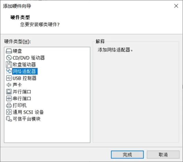 3.3选择“网络适配器”,点击完成。返回上一级界面后,点击确定。