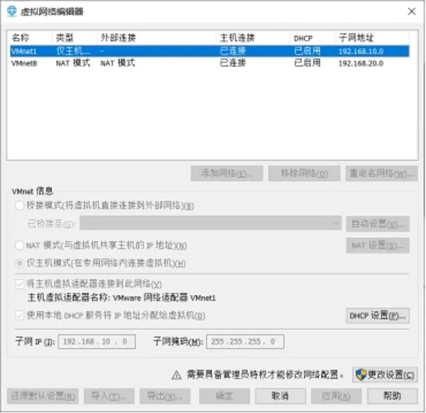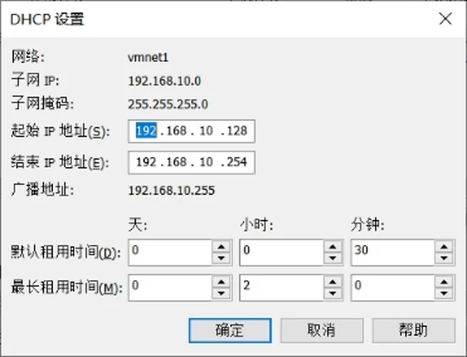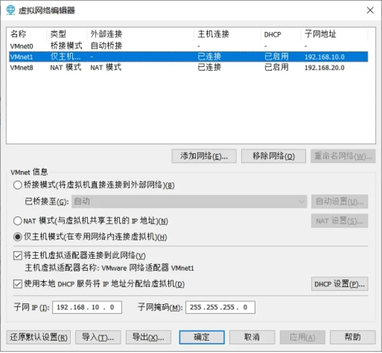 3.6网络编辑器里会生成VMnet0,不用管他。选中VMnet1,在下方的子网IP和子网掩码修改为图中数据。即IP(192.168.10.0)子网掩码(255.255.255.0)改完数字,点击“DHCP设置”按钮,进入下图。