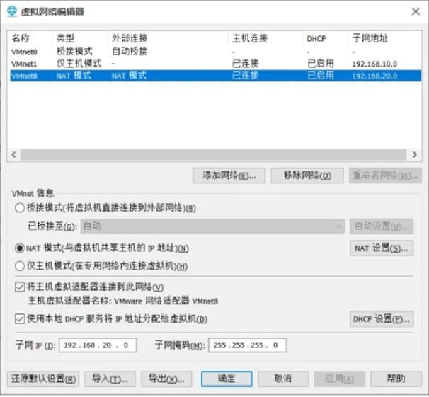 3.9设置NAT网关IP:“192.168.20.2”,所有虚拟机将通过该网关通过宿主机连接互联网。注意,网关不能设置为该网段的起始IP:“192.168.20.1”,因为该地址已经默认给名为“VMnet8”的虚拟网卡使用了。