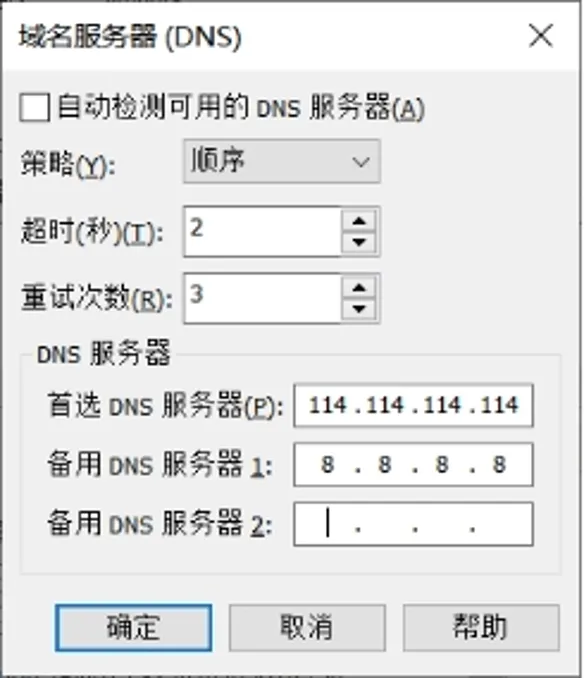 3.10在图中配置DNS服务器。这里我们选择容易记忆的中国电信公众DNS服务器“114.114.114.114”为首选服务器,谷歌公司提供的全球DNS服务器“8.8.8.8”做备用服务器。单击“确定”按钮关闭DNS设置界面,返回上一层界面。