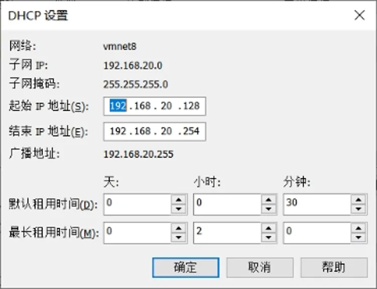 3.11回到上图的界面,当前还是选中vmnet8,点击“DHCP设置”,进入下图。设置好DHCP自动分配的起始与结束的IP地址(其实主要改第三位的数值,大家可以看一下自己的电脑和我这个数据只有第三段不同),单击“确定”按钮关闭设置。