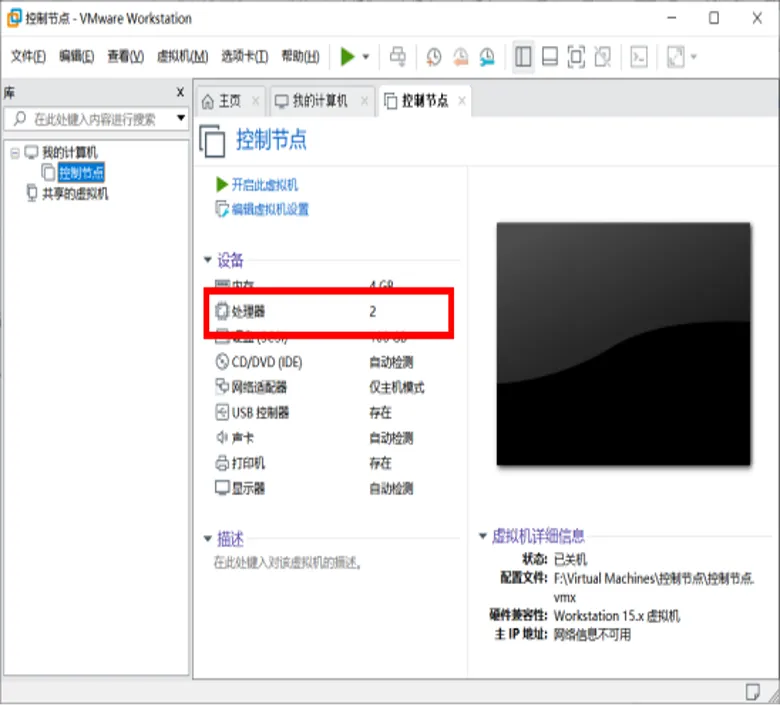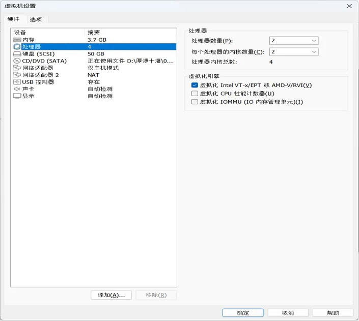 4.1回到主界面,选中虚拟机,点击处理器,打开如下界面: