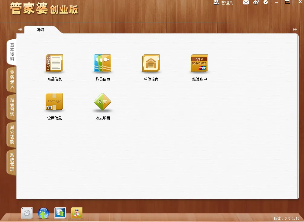 比如说基本资料分类下有管理商品信息、职员信息、单位信息、结算账户、仓库信息、收支项目等。基本信信息主要就是一些常用的功能实现。方便查看和管理来用。