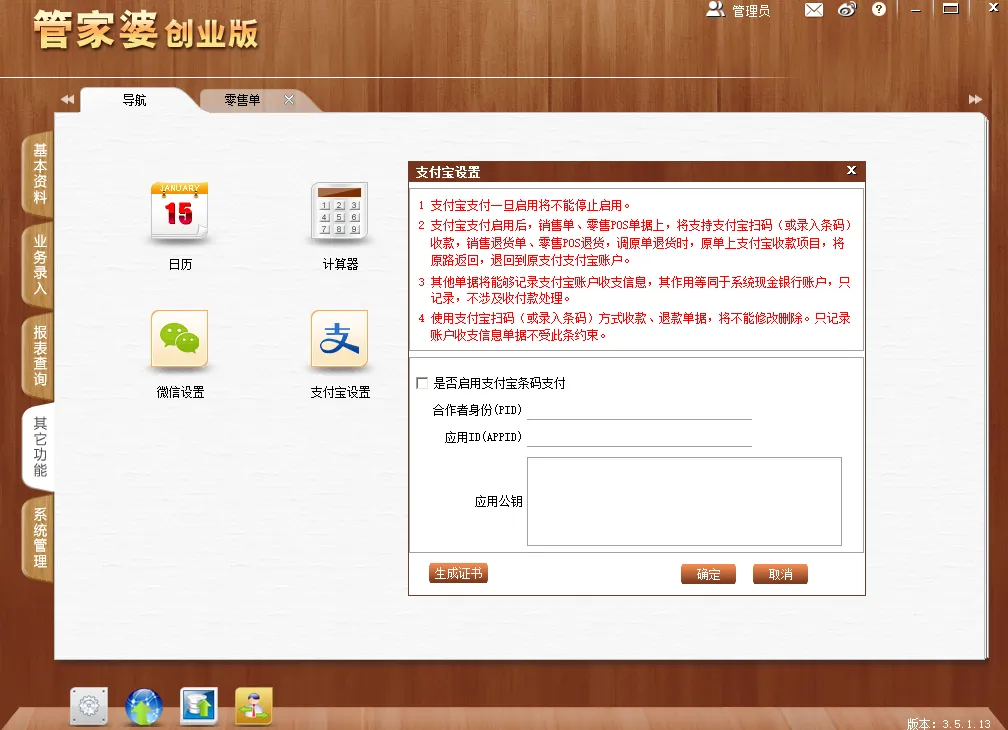 软件就只有5大类,分为基本资料、业务录入、报表查询、其他功能和系统管理5个功能,从截图中可以看到,每一个功能下又不同的使用场景。