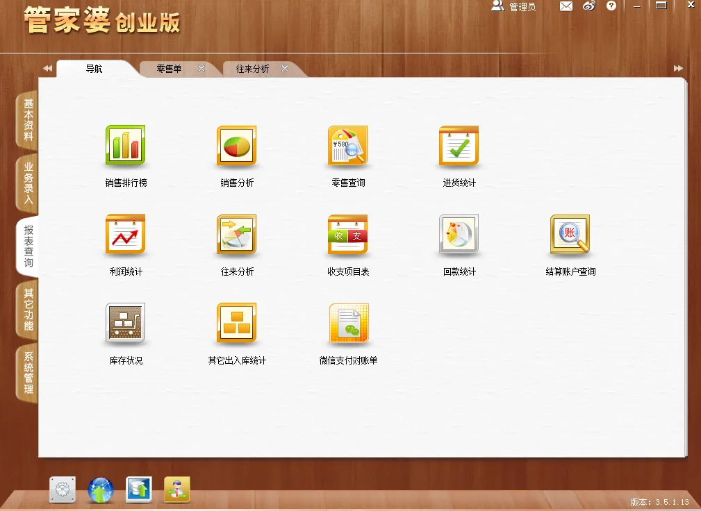 报表查询功能为:销售排行榜, 销售分析, 零售查询, 进货统计, 利润统计, 往来分析, 收支项目表, 回款统计, 结算账户查询, 库存状况, 其它出入库统计, 微信支付对账单