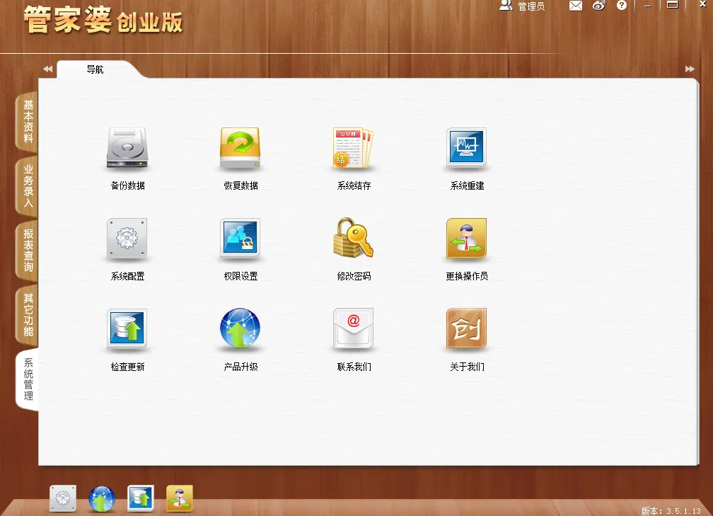 系统管理功能分为:备份数据, 恢复数据, 系统结存, 系统重建, 系统配置, 权限设置, 修改密码, 更换操作员, 检查更新, 产品升级, 联系我们, 关于我们