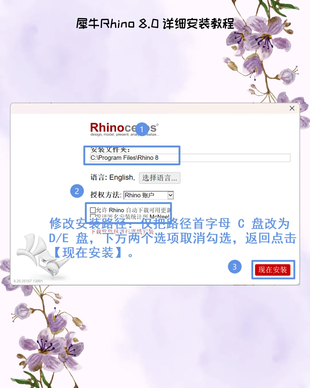 2. 齿轮配置:不要直接安装,点击右侧齿轮按钮。将路径首字母 C 改为D盘,取消勾选下方两个选项。