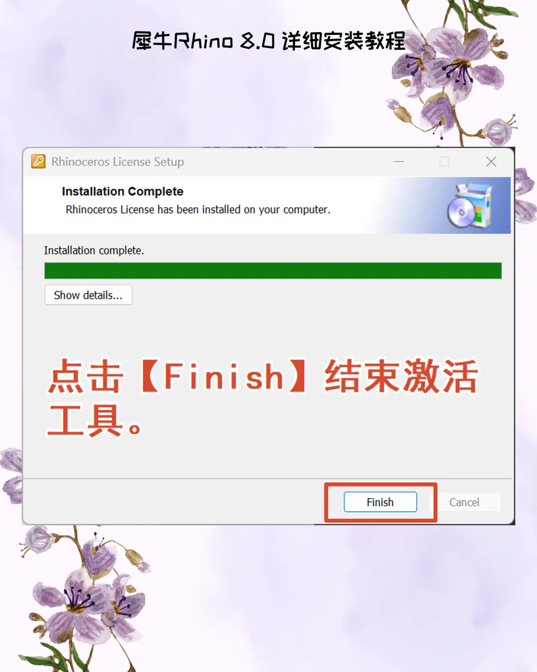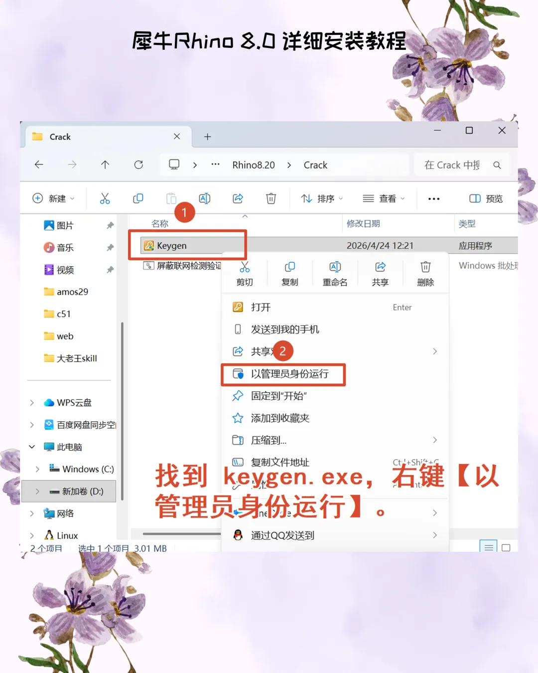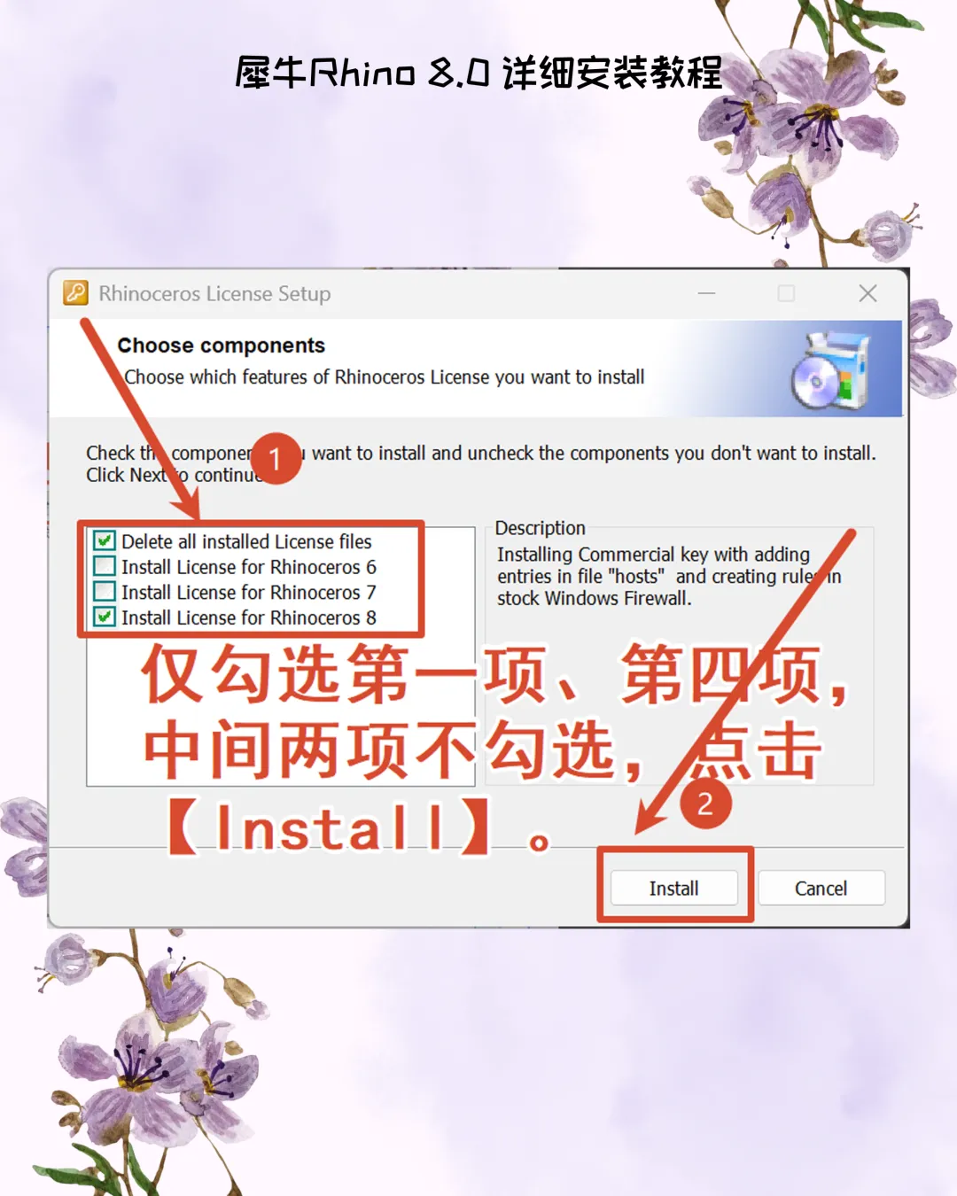 1. 运行 Keygen:管理员运行keygen.exe。勾选第一项和第四项(跳过中间两项),点击 Install 并在完成后点 Finish。