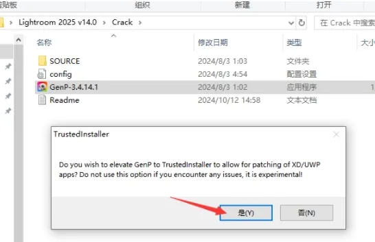 9. 在弹出的对话框中选择“是”。如果出现错误界面,请关闭后重新运行注册机,并在弹出对话框中选择“否”。