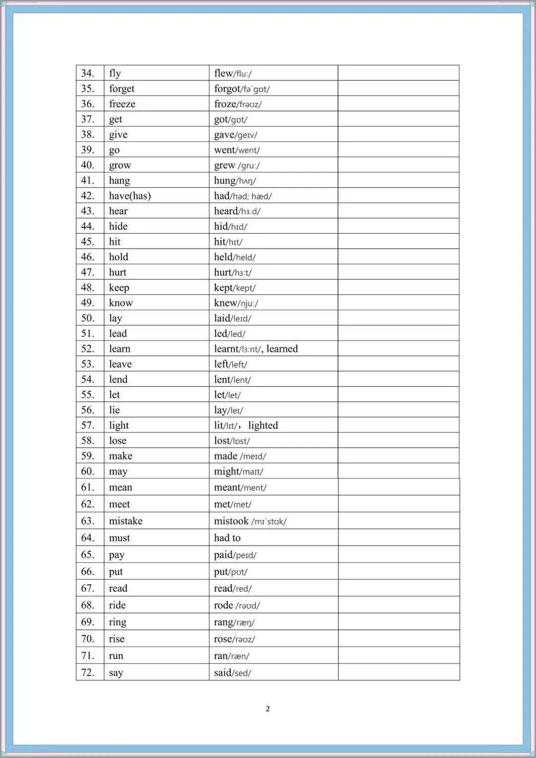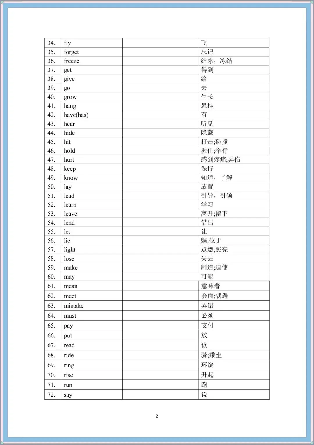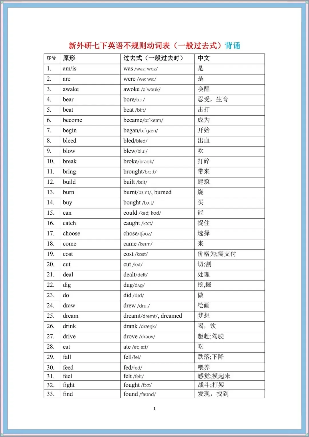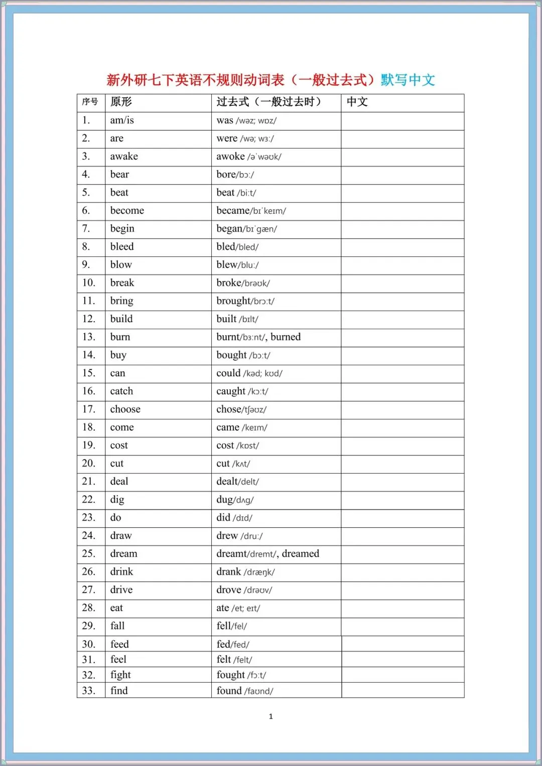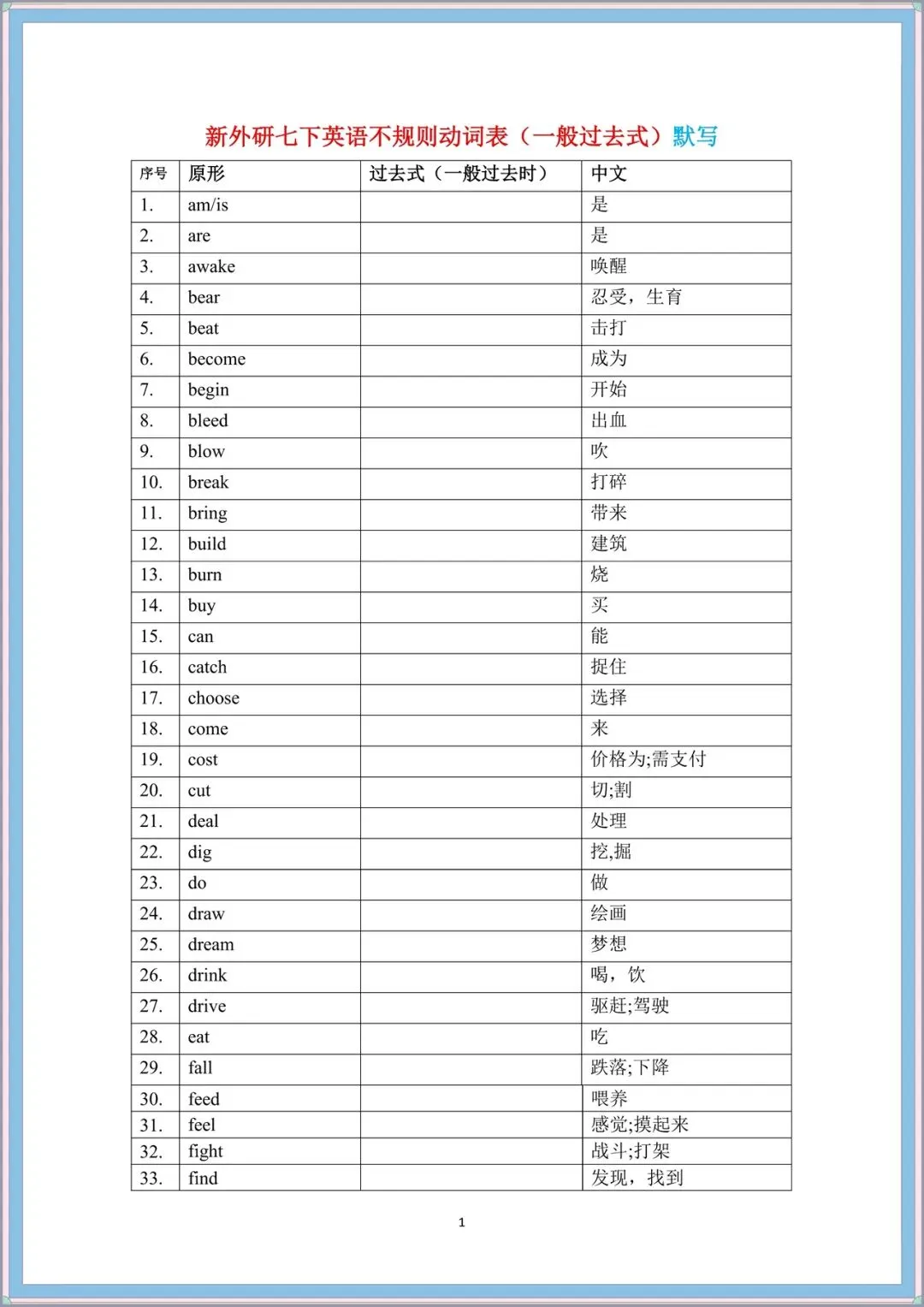 2026新(外研版)七年级下册《英语》不规则动词表(背诵版+默写版),电子版可打印!