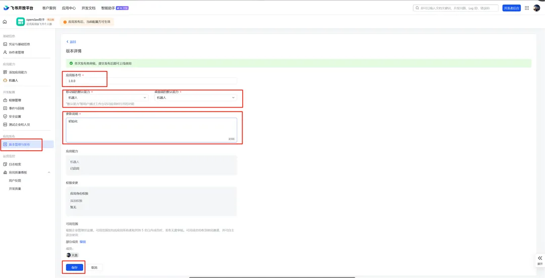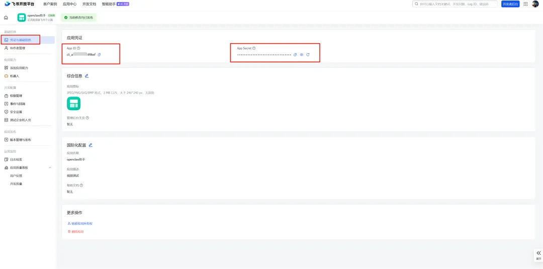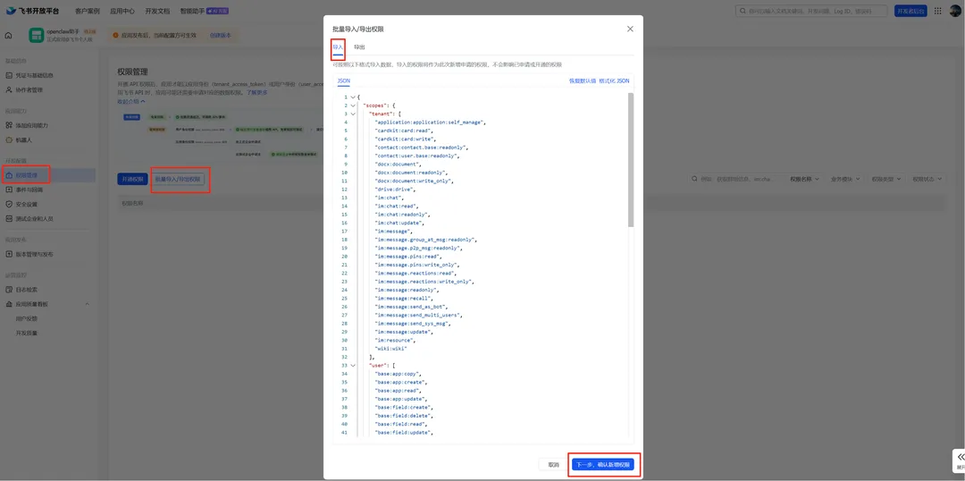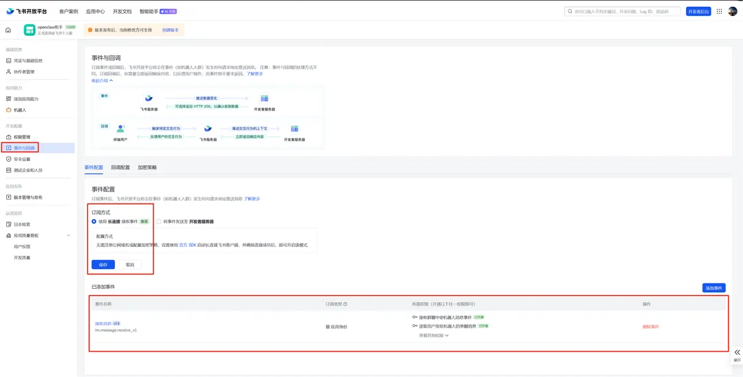 JSON{ "scopes": { "tenant": [ "application:application:self_manage", "cardkit:card:read", "cardkit:card:write", "contact:contact.base:readonly", "contact:user.base:readonly", "docx:document", "docx:document:readonly", "docx:document:write_only", "drive:drive", "im:chat", "im:chat:read", "im:chat:readonly", "im:chat:update", "im:message", "im:message.group_at_msg:readonly", "im:message.p2p_msg:readonly", "im:message.pins:read", "im:message.pins:write_only", "im:message.reactions:read", "im:message.reactions:write_only", "im:message:readonly", "im:message:recall", "im:message:send_as_bot", "im:message:send_multi_users", "im:message:send_sys_msg", "im:message:update", "im:resource", "wiki:wiki" ], "user": [ "base:app:copy", "base:app:create", "base:app:read", "base:app:update", "base:field:create", "base:field:delete", "base:field:read", "base:field:update", "base:record:create", "base:record:delete", "base:record:retrieve", "base:record:update", "base:table:create", "base:table:delete", "base:table:read", "base:table:update", "base:view:read", "base:view:write_only", "board:whiteboard:node:create", "board:whiteboard:node:read", "calendar:calendar.event:create", "calendar:calendar.event:delete", "calendar:calendar.event:read", "calendar:calendar.event:reply", "calendar:calendar.event:update", "calendar:calendar.free_busy:read", "calendar:calendar:read", "contact:contact.base:readonly", "contact:user.base:readonly", "contact:user.employee_id:readonly", "contact:user:search", "docs:document.comment:create", "docs:document.comment:read", "docs:document.comment:update", "docs:document.media:download", "docs:document:copy", "docx:document:create", "docx:document:readonly", "docx:document:write_only", "drive:drive.metadata:readonly", "drive:file:download", "drive:file:upload", "im:chat.members:read", "im:chat:read", "im:message", "im:message.group_msg:get_as_user", "im:message.p2p_msg:get_as_user", "im:message:readonly", "offline_access", "search:docs:read", "search:message", "space:document:delete", "space:document:move", "space:document:retrieve", "task:comment:read", "task:comment:write", "task:task:read", "task:task:write", "task:task:writeonly", "task:tasklist:read", "task:tasklist:write", "wiki:node:copy", "wiki:node:create", "wiki:node:move", "wiki:node:read", "wiki:node:retrieve", "wiki:space:read", "wiki:space:retrieve", "wiki:space:write_only" ] }}4)事件配置:选择长连接和接收消息