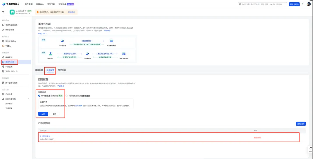 5)回调配置:选择长连接和卡片回传