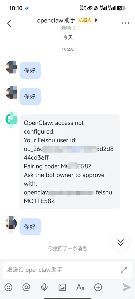 用飞书机器人对话触发了匹配认证,搜索一下如何完成飞书机器人的匹配认证,然后再处理下,不要出错了,处理后自己验证好飞书通道是否可以正常对话。或者把飞书的这段代码直接发给Trae或者opencode处理也可以;