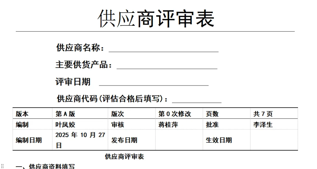 A)若实际需要时由评审员到供应商处进行实地调查并对供应商的生产能力、质量体系及其它项目进行审核取回样品进行检测填写《供应商评审/评估表》。