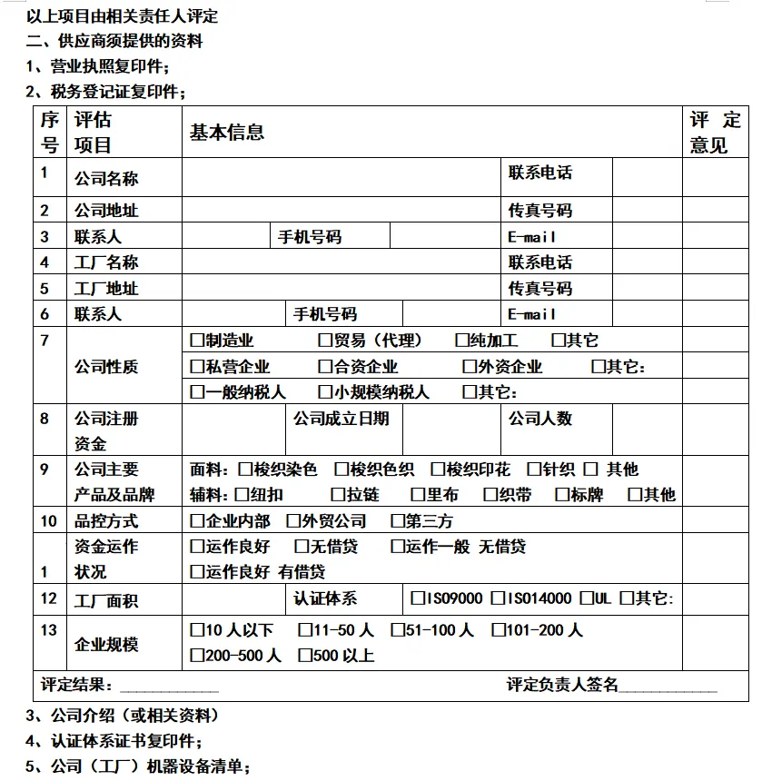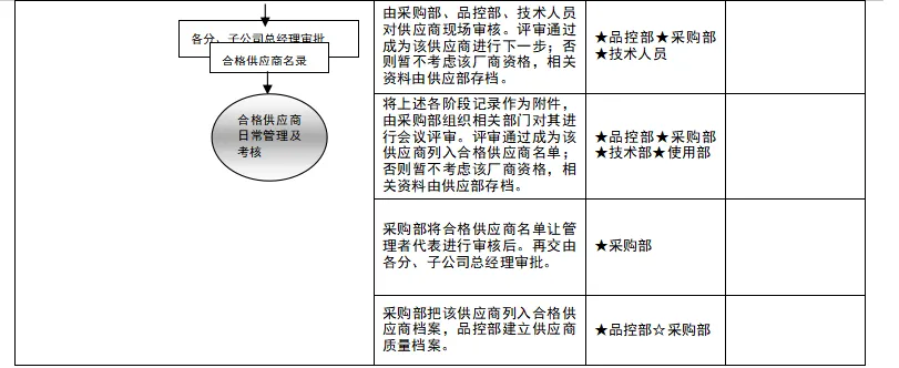 供应部对《供应商调查问卷》进行初步评价需确定采购的材料是否符合国家法律法规和安全要求对于危险品需要求供应商提供相关证明文件及检测报告。