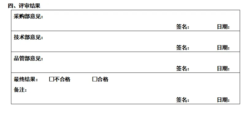 4 供应商评估因环境因素而无法进行实际评审时可用样品方式进行检测评估。