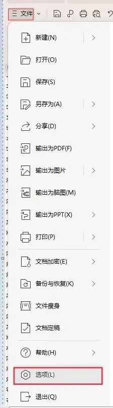 1.点击文档左上角文件按钮,在弹出栏选择选项。