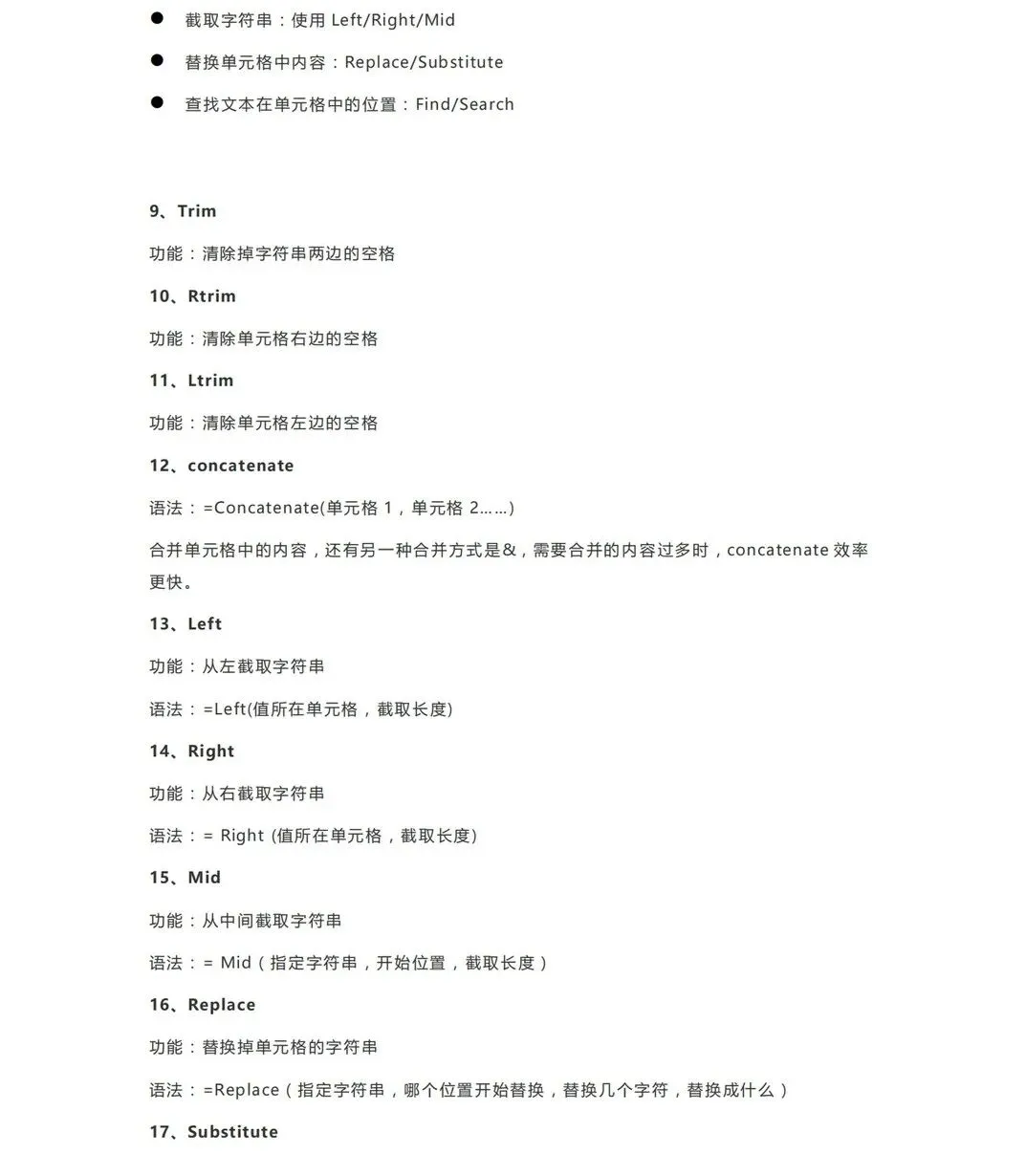 数据清洗可是数据分析的关键第一步,容不得马虎!Trim、Ltrim、Rtrim 能帮你清除字符串中的空格,让数据变得干净整洁。合并单元格用 Concatenate 函数,比直接用“&”符号更高效便捷。Left、Right、Mid 可用于截取字符串指定部分,Replace 和 Substitute 负责替换文本内容,Find 和 Search 能快速定位文本位置,Len 和 Lenb 用来统计字符个数,一套操作下来,数据清洗轻松搞定!📌 逻辑运算类