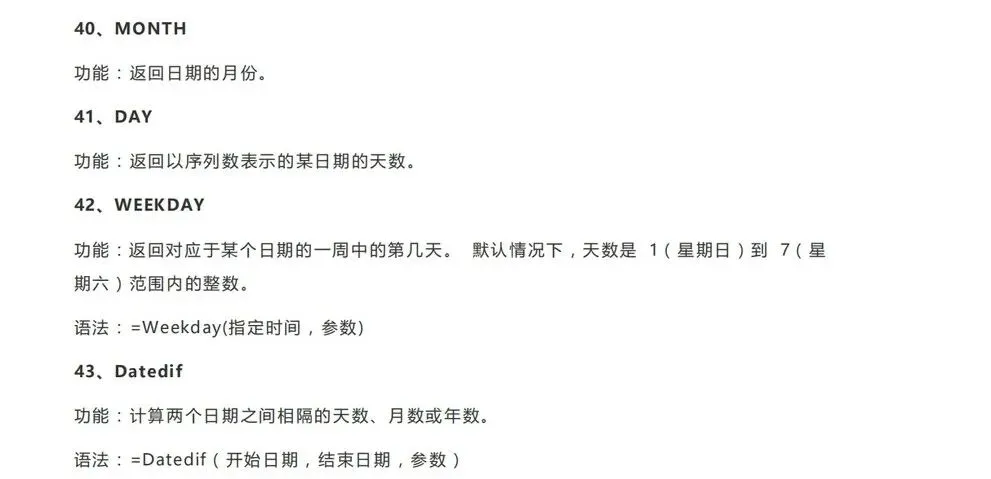 处理时间数据有专属“神器”函数!TODAY 和 NOW 可快速获取当前日期和时间,YEAR、MONTH、DAY 能分别提取日期中的年、月、日,WEEKDAY 可确定某一天是星期几,Datedif 用于计算两个日期之间的间隔,时间分析从此不再繁琐。蕞后提醒大家,函数不用死记硬背,记住它的用途和核心参数就好,遇到复杂问题随时求助搜索引擎即可。掌握这43个Excel函数,数据分析效率直接拉满!赶紧动手实操起来,让数据处理变得简单又高效~