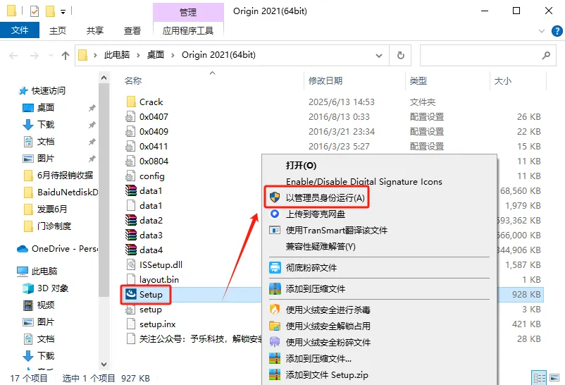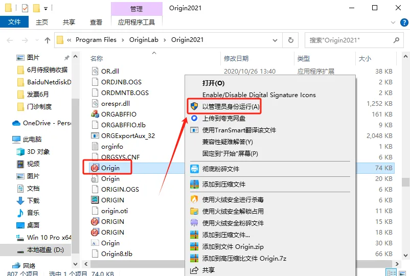 21. 右击【Origin】粘贴项后,挑选【以管理员模式启动】(直接执行,无需界面)。