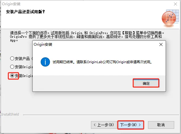 5.选取【OriginPro试用版安装】,点击【继续】,再点击【确认】。