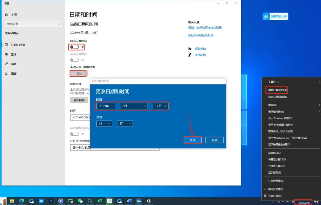 电脑设置时间调整后,待安装完毕再行回置。操作步骤如下:点击桌面右下角时间日期,进入“调整日期和时间”,停用自动更新时间,手动设置时间选择“更改”,设定目标时间点为2019年2月17日,执行保存即可。见以下操作指引: 1>桌面时间点选 2>设置窗口调用 3>关闭自动调整 4>进入手动设定 5>设置特定日期:2019年2月17日 6>点击确定更改