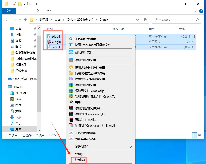 打开【crack】文件夹,全部选定其中的项目,然后利用鼠标右键点击,选择复制操作。