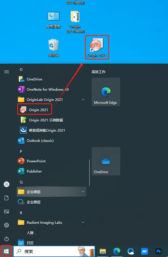 17.构建桌面启动方式:轻触电脑桌面左下端【开始】图标,选择【全部应用】,寻找并将【Origin 2021】图标拖拽至桌面。