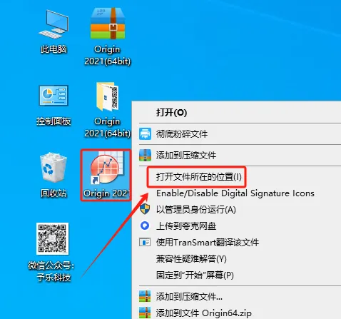18. 右击【Origin 2021】快捷方式后,点击【显示文件位置】。
