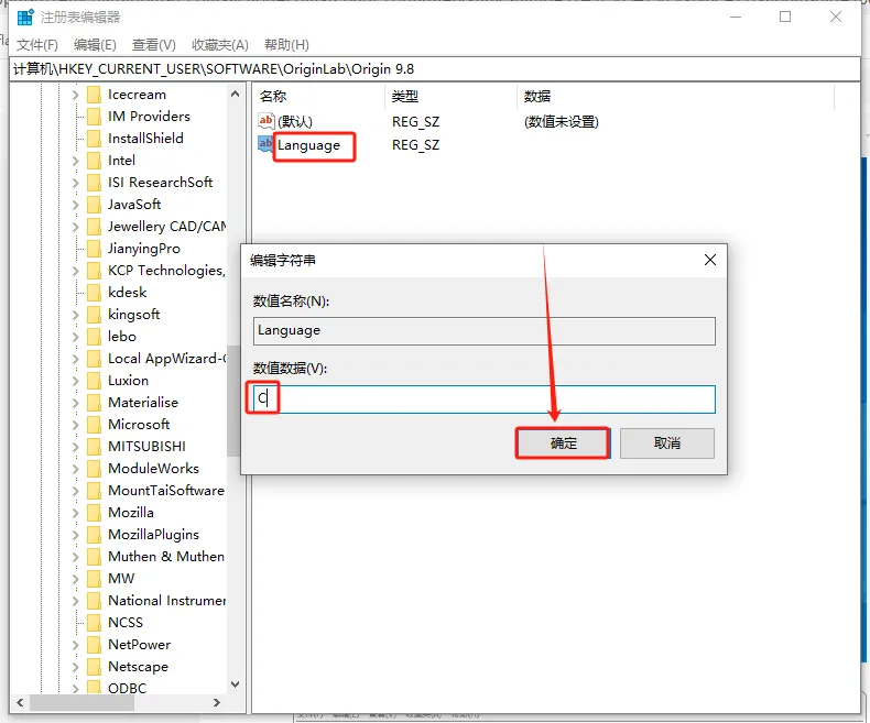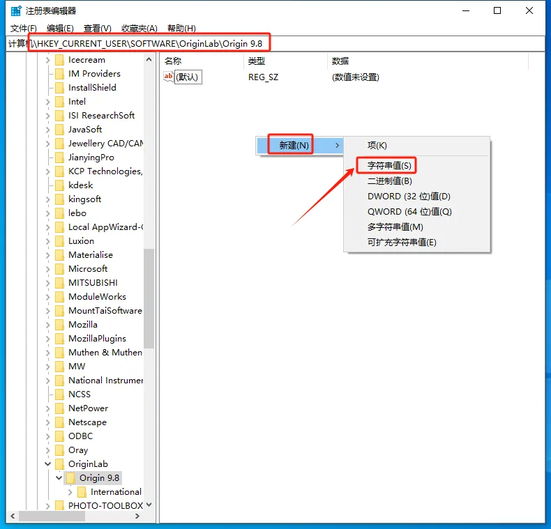 展开路径至 HKEY_CURRENT_USER\Software\OriginLab\Origin 9.8,在右侧空白区域鼠标右击后选【新建】→【字符串值】,然后将新创建的文件命名为【Language】。