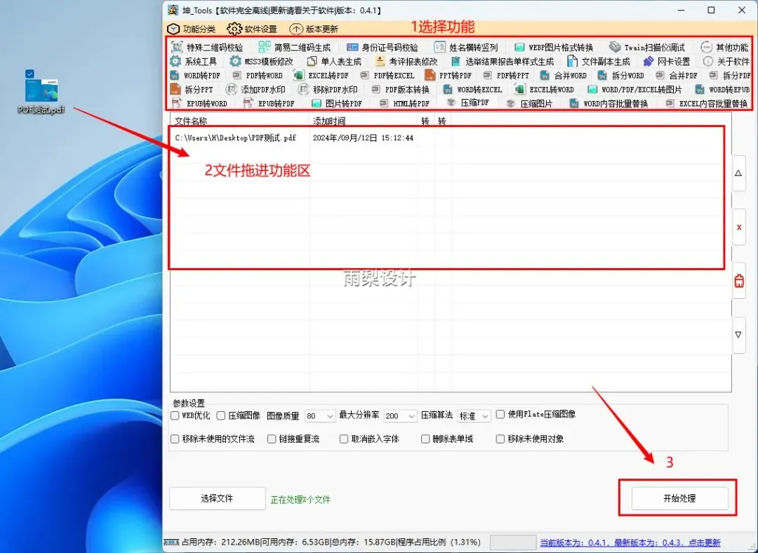 5.①选需要的功能;②拖拽文件到窗口;③点击【开始处理】