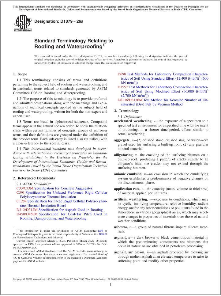 欢迎订购ASTM D1079-2026a【PDF原文+中文翻译版】屋面与防水相关标准术语